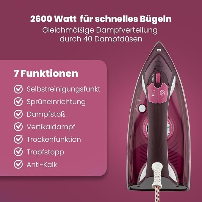 - Utilisez ce fer avec en profitant de toutes les fonction disponibles : pulvérisation, jet de vapeur, vapeur verticale, séchage (la vapeur peut être désactivée) autonettoyante (commutable), fonction anti-goutte, filtration du calcaire.